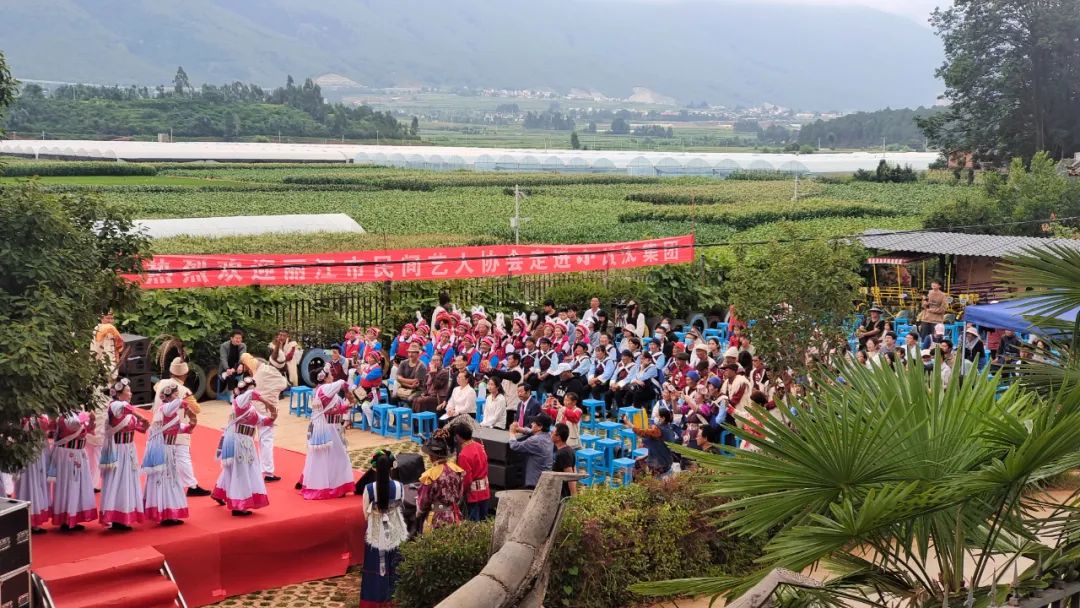 座谈会结束,丽江民间艺人协会和小溪流全体员工共200多人乘车到全国传统古村落丽首古村古村人家进行演出联欢。